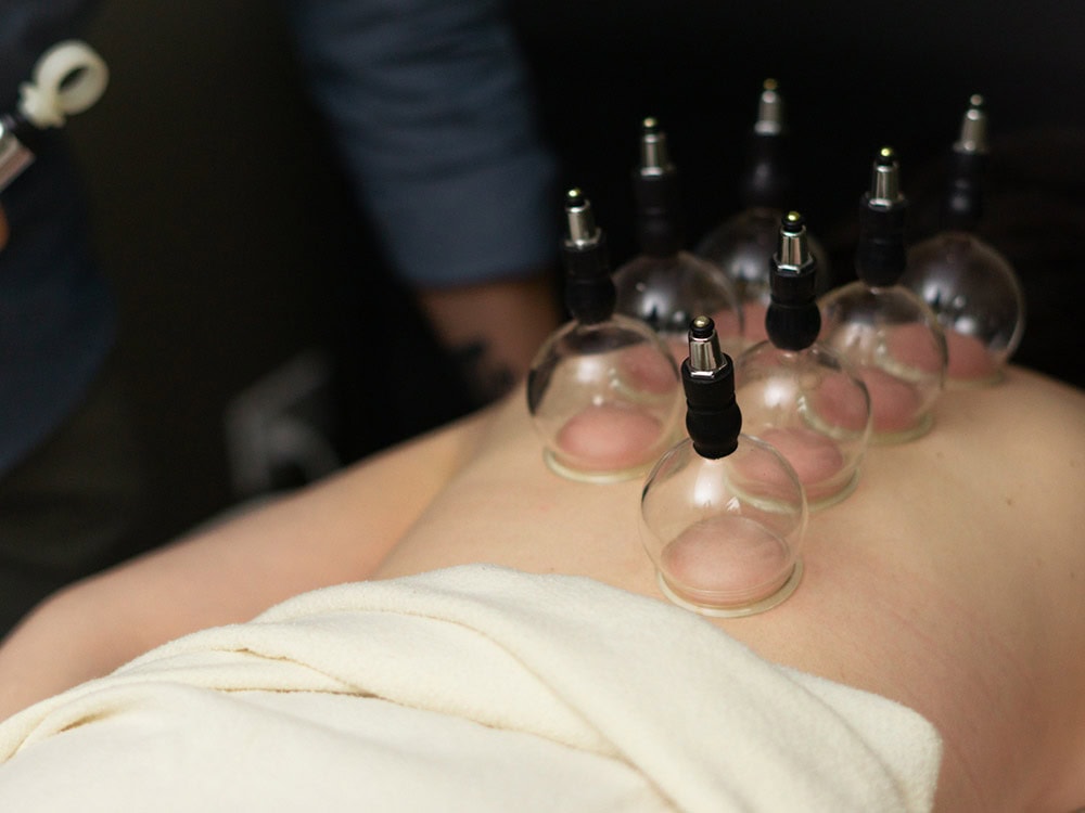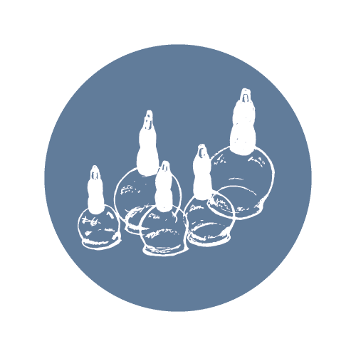 Through a suction technique, glass cups are placed on the body in specific areas to separate the muscles and fascia to promote blood flow and to release toxins in areas of distress.