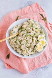 Potato salad is a classic for summer cooking. However, potatoes and mayonnaise can make the dish unnecessarily heavy. This recipe substitutes potatoes for cauliflower, which makes it packed with protein!