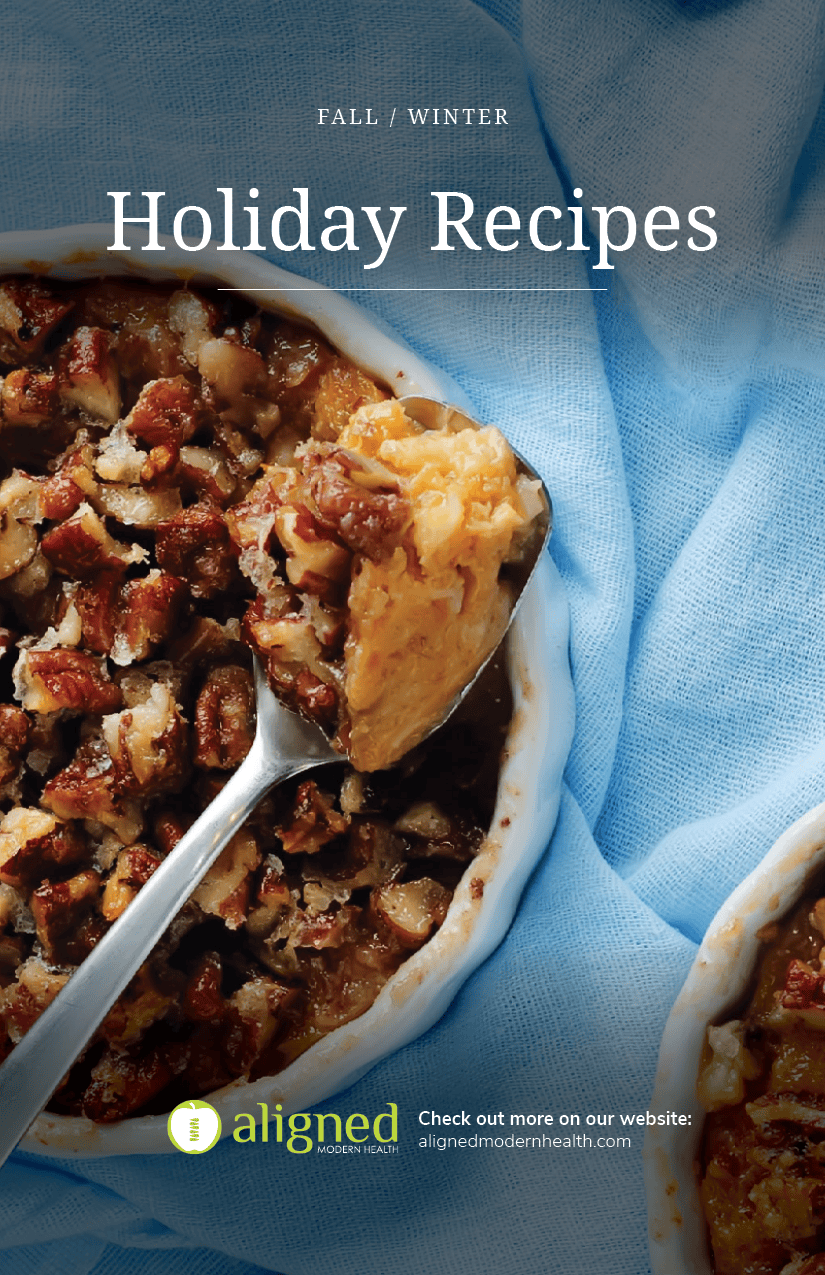 In our guide you will find delicious, nutritionally focused holiday recipes curated by our team of Functional Medicine & Clinical Nutrition experts. Our recipes are delicious and importantly appropriate for many guests with dietary needs. Also included is Special Holiday Savings from Aligned Modern Health and our partners at KitchFix!