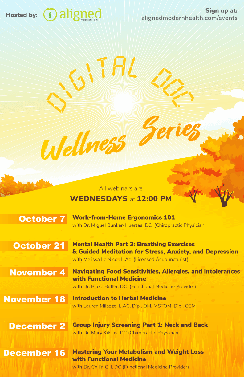 With the seasons changing, many of us are doing what we can to feel our best physically and emotionally. Which is why we decided to extend our Digital Doc Series! Tune into our live series where our expert providers in Acupuncture and Functional Medicine & Clinical Nutrition discuss how to deal with everyday concerns. These interactive webinars will give you a chance to engage with our providers and ask questions directly during the presentation.